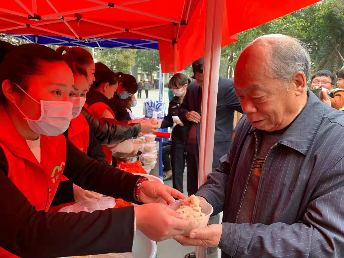 在東陽社區,志愿者們將一碗碗噴香的“拗九飯”送到社區老人手中,與老人親切交談,告知老人今天是拗九節,吃上一碗甜蜜的糯米飯,寓意著平安、健康、吉祥。