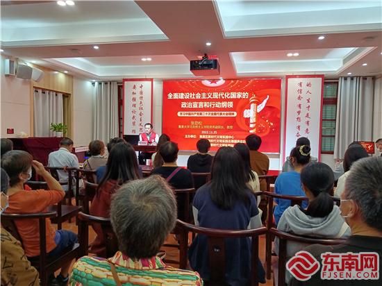 活動邀請集美大學馬克思主義學院常務副院長、教授張勁松為黨員群眾開講。現場,張勁松以《全面建設社會主義現代化國家的政治宣言和行動綱領——學習黨的二十大精神》為題,從“新時代十年的偉大變革”“開辟馬克思主義中國化時代化新境界”“中國式現代化道路”“新時代黨的建設新的偉大工程”四個部分,飽含激情、條分縷析地對黨的二十大精神進行系統深入宣講。