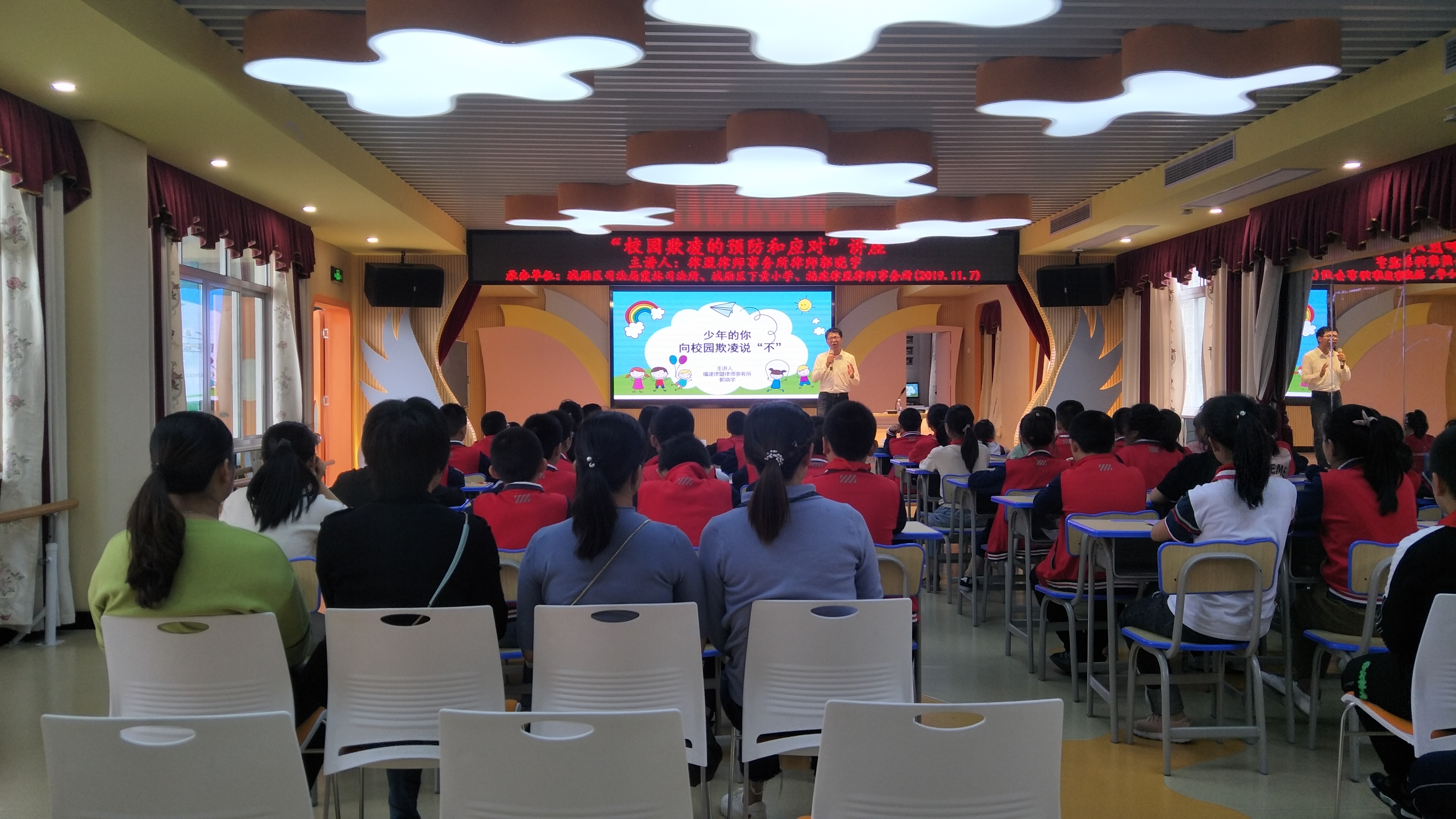 律師郭曉宇以“少年的你,向校園欺凌說‘不’”為題,引用生動案例,向參加本次活動的師生及家長代表分別從“什么是校園欺凌”“校園欺凌的危害”“校園欺凌產生的原因”“如何預防校園欺凌”等四個方面進行了詳細的闡述。他同時教育學生們要敢于和欺凌行為說不,不做校園欺凌的施暴者、承受者、旁觀者。專題講座結束后,家長和老師代表也分別發言,表示共同抵制校園暴力,拒絕校園欺凌。