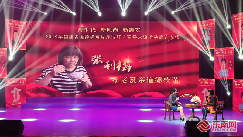 活動中,5位道德模范和身邊好人代表與觀眾進行交流、分享他們的感人事跡。他們當中,有十幾年如一日照顧病重婆婆的孝道典范、中國好人、惠安縣孝老愛親道德模范張利梅;有堅持三十多年扶貧助殘的福建省助人為樂道德模范陳欠水;有赤手搏斗持刀歹徒的泉州市見義勇為道德模范陳培川;有做人誠實、做事誠信、重諾守信的惠安縣誠實守信道德模范林和輝;有“馬路天使”、默默奉獻在交通崗位上的惠安縣敬業奉獻道德模范王燦峰……現場觀眾用一次次經久的掌聲表達對榜樣的致敬和對道德的禮贊。