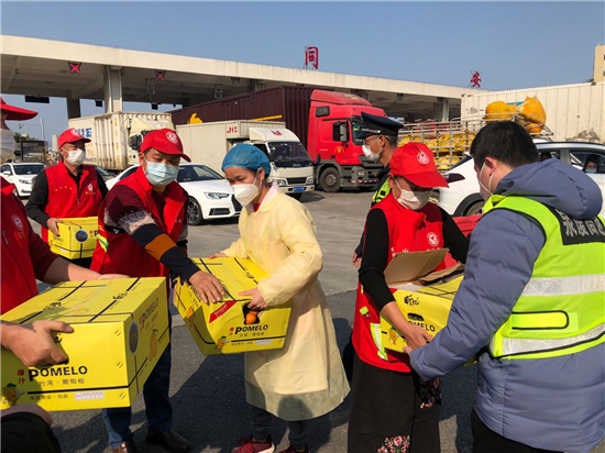 企業(yè)捐贈的水果分發(fā)到值勤志愿者、交通執(zhí)法、醫(yī)護等一線人員手中。葉春躍 攝