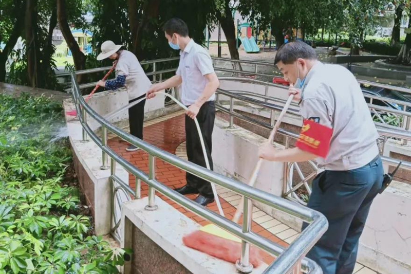 小區(qū)物業(yè)清洗小區(qū)公共區(qū)域。湖里區(qū)委文明辦供圖