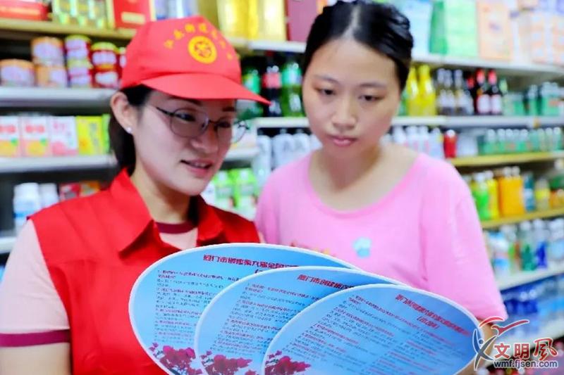 志愿者向沿街商家宣傳文明創建知識。陳財根攝