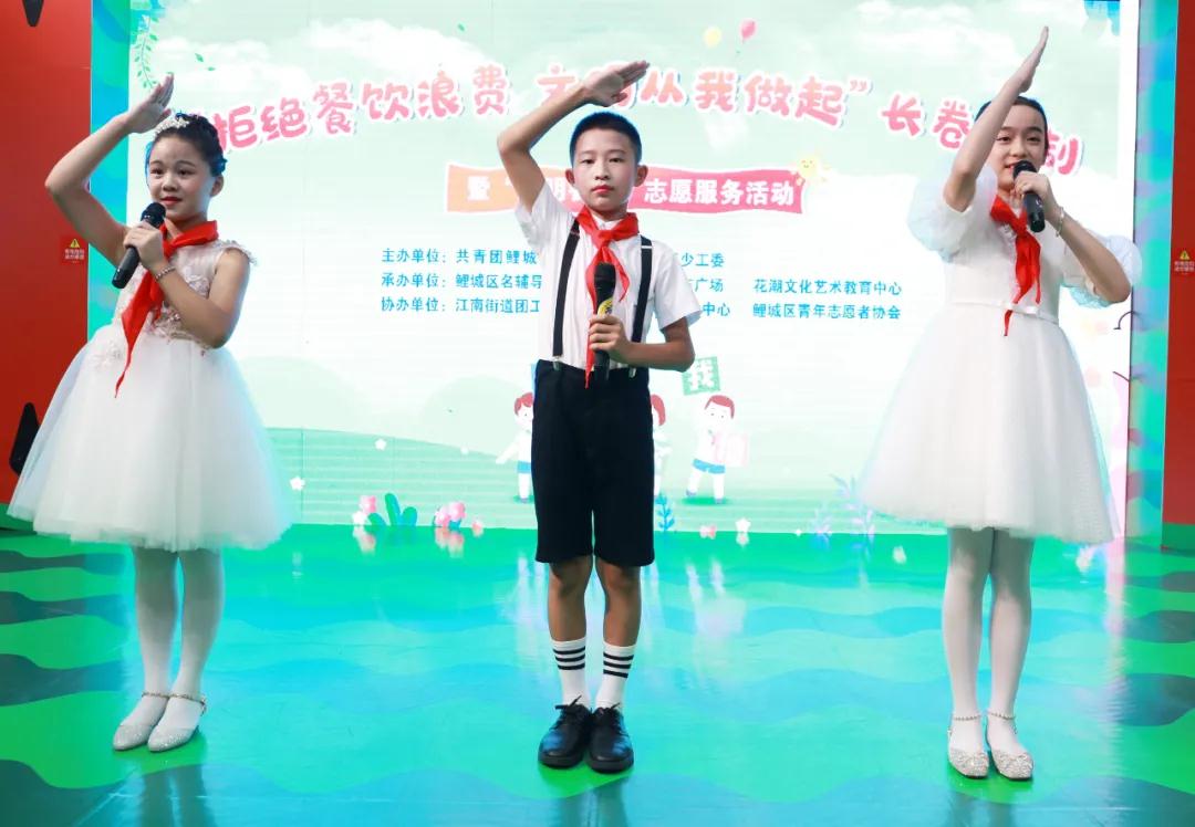 活動一開始,3名少先隊員率先登上舞臺,齊聲朗誦《厲行節約,反對浪費》,清脆的童聲在商場大廳回蕩。