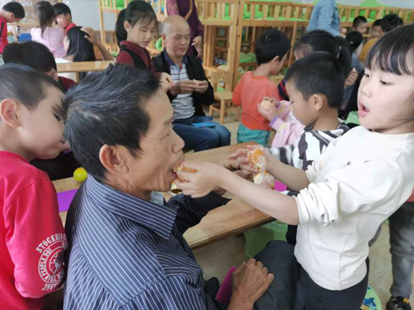 安溪九幼開展“童心敬老、孝暖重陽”主題活動,小朋友們請爺爺奶奶吃橘子。安溪九幼 供圖