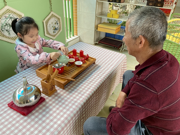 安溪十幼的小朋友向長輩獻菊花茶。吳小燕 供圖