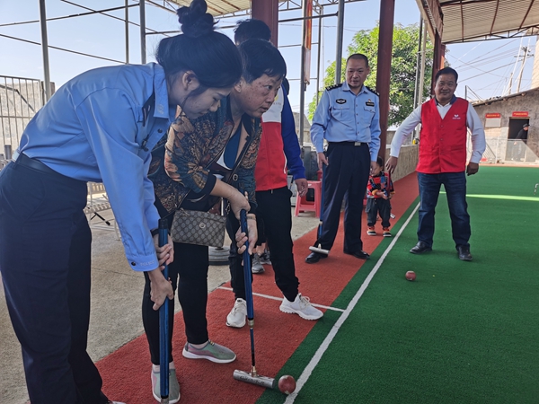 參內(nèi)派出所的民警向鎮(zhèn)巖前村老人協(xié)會的老人們請教門球打法。參內(nèi)派出所 供圖