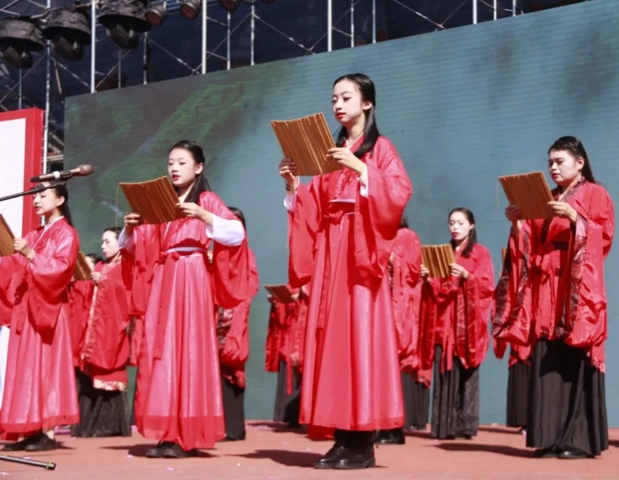 柏洋村的行孝禮儀習俗展示《讀祝文》是本次活動獻給老人的第一道“孝文化大餐”,32位身著飄逸漢服的女子款款而來,手捧竹簡,齊聲恭讀“祝文”,字字鏗鏘。