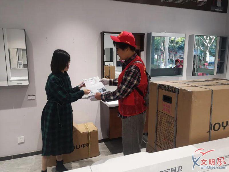 志愿者們向商家發放《誠信經營倡議書》(金山社區供圖)