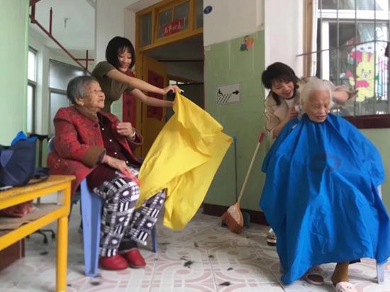 林劍涵和員工為老人剪發。(湖里區委文明辦供圖)