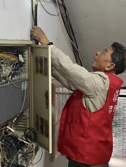 老黨員志愿者洪祖賢在檢查小區(qū)電線。(湖里區(qū)委文明辦供圖)
