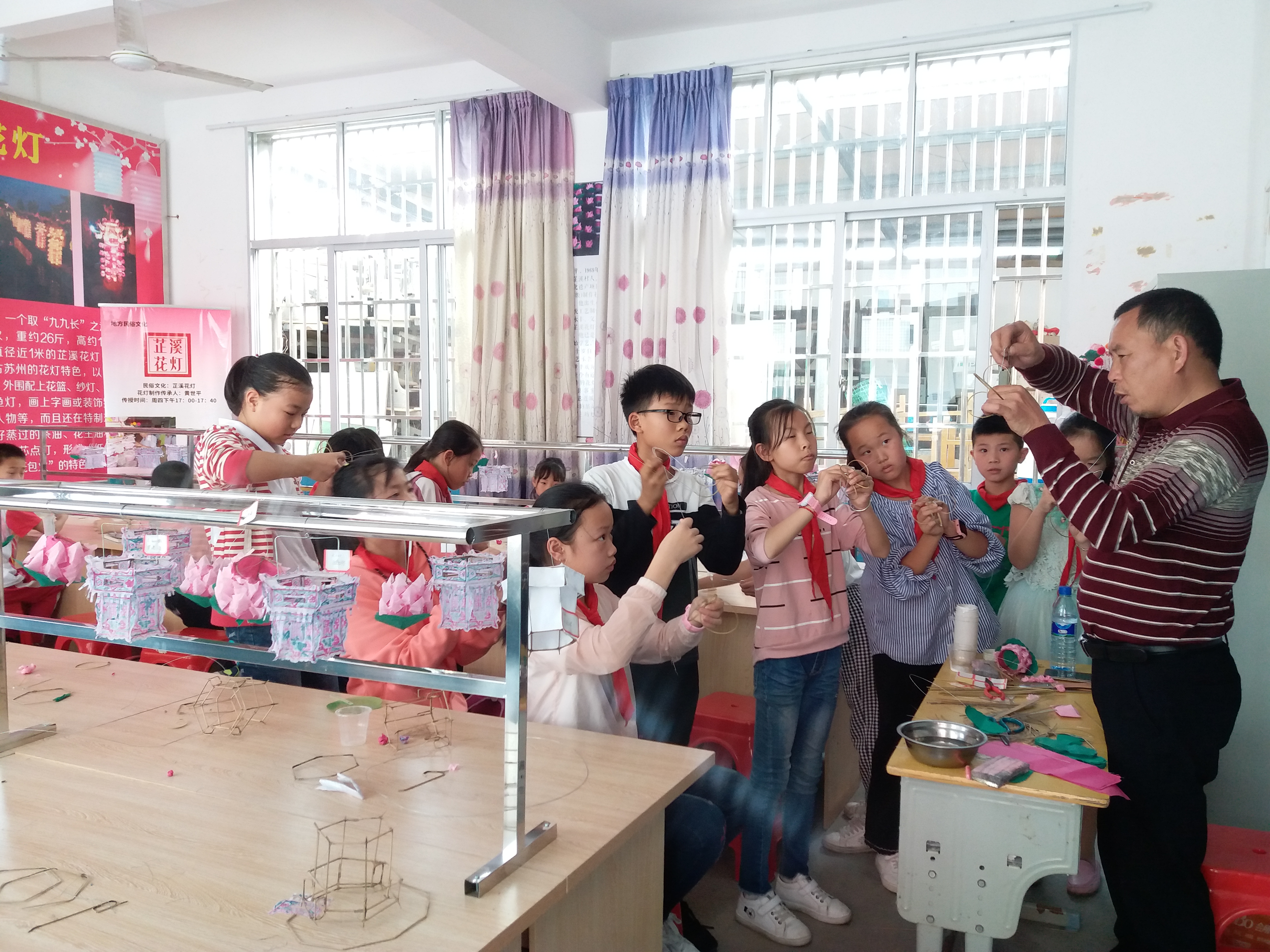 顏色鮮艷,款式多樣,芷溪花燈美不勝收。廟前中心小學利用傳承300多年的芷溪花燈制作作為學校特色項目,專門聘請芷溪花燈市級制作技藝傳承人黃世平老師擔任花燈制作輔導員、傳統刺繡愛好者江秀妹老師擔任傳統刺繡輔導員,培養學生對民間傳統藝術興趣,發揮想象,培養學生的創新精神和實踐能力。(圖四)