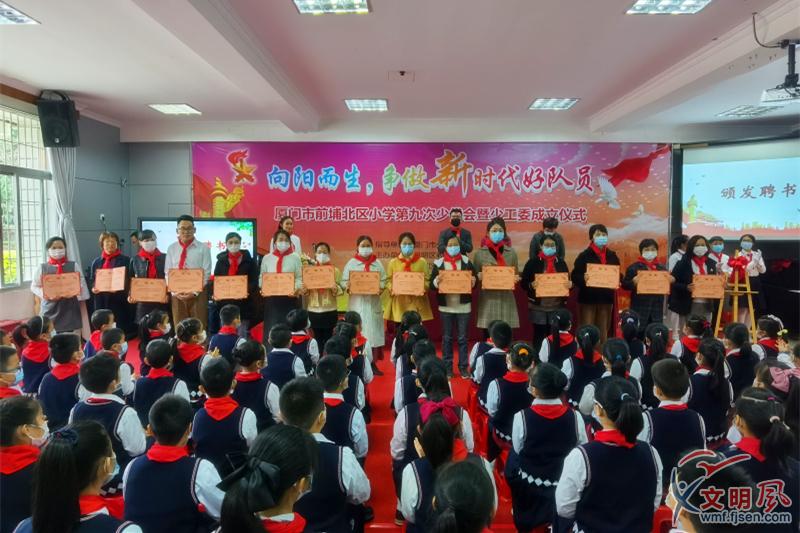 隨后,石亞珠宣讀了學校少工委組織機構名單,并邀請領導嘉賓們為少工委成員們頒發聘書。思明區教育局紀工委書記林小紅和思明區教育少先隊總輔導員呂文耀共同為“廈門市前埔北區小學少工委”授牌,前埔北區小學少先隊工作委員會正式成立。
