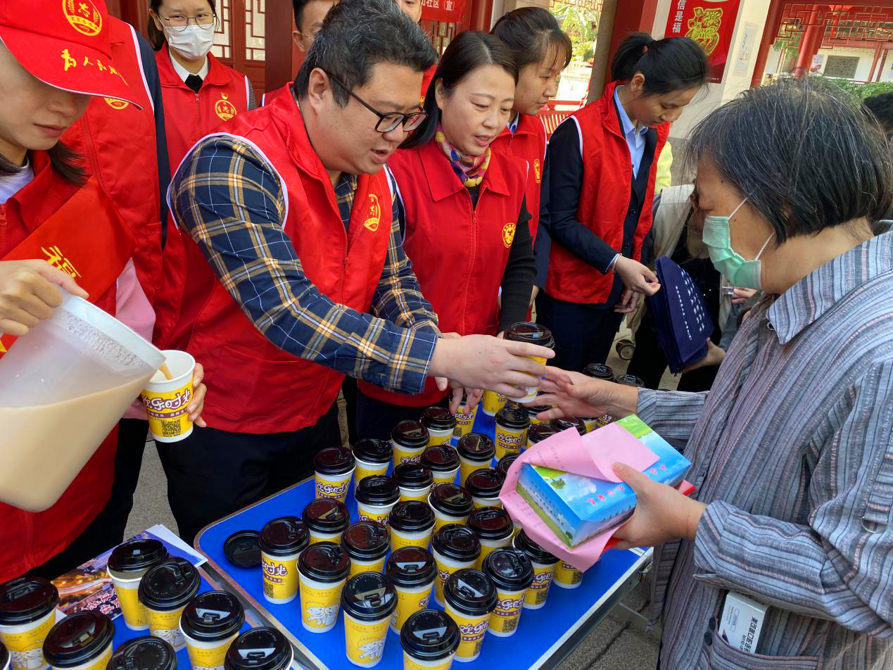 為老年群眾獨家定制桂圓紅棗茶、豆漿等數種熱飲。(鼓樓文明辦供圖)