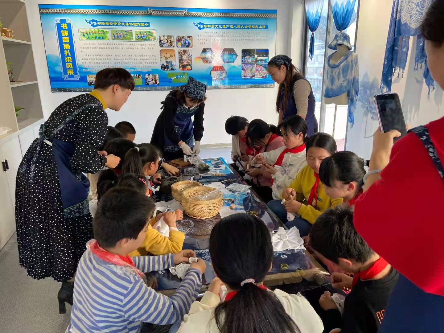 書峰學校抓住契機、立足本土,秉承“因地制宜、宜農(nóng)則農(nóng)”的原則,精心謀劃鄉(xiāng)村少年宮發(fā)展思路,制定了以“傳承青黛扎染技藝”為目標的特色項目,并以此為切入點結(jié)合進行系列勞動教育,使學生在活動中感悟勞動創(chuàng)造一切、財富源于勞動的價值觀、金錢觀,養(yǎng)成“勞動從我開始”的社會自覺性;同時與德育、智育、體育、美育貫通融合,引導學生“扣好人生的第一粒扣子”,為奠定學生正確的世界觀、人生觀、價值觀打下堅實的基礎(chǔ)。