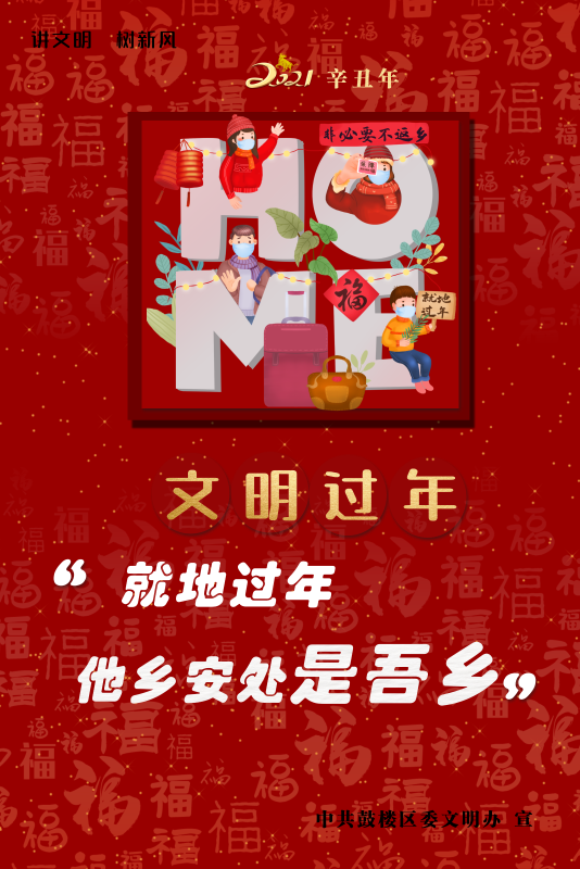 文明風1月26日訊(通訊員吳芳 /圖文)面對新冠疫情,為過好2021年春節,福建省福州市鼓樓區委文明辦用文明引導就地過年,推出公益“文明過年”主題年畫報,畫中有“話”,用心留人,以情動人,以文明城市呼喚文明市民一起:就地過年、健康過年、文明過年、廉潔過年、暖心過年、平安過年!引導廣大市民群眾共同行動起來,筑牢疫情群防群控、群策群治的堅實防線,一起過一個祥和、平安的新春佳節。(鼓樓區委文明辦)