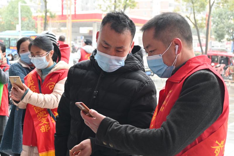 志愿者們在車站出入口、候車室開展文明引導志愿服務行動,勸導出入動車站的群眾要自覺佩戴口罩、接受體溫測量、出示健康碼,同時發放疫情防控宣傳單、返鄉人員登記二維碼宣傳單和文明宣傳手冊。幫助旅客使用客戶端和自動售票機辦理購票、取票業務,針對部分不會使用智能手機或沒有手機的旅客,志愿者還通過教授使用智能手機、采用人工登記等方式,為旅客提供數字化便民服務,幫助他們快速通過卡口,為他們的出行提供便利。