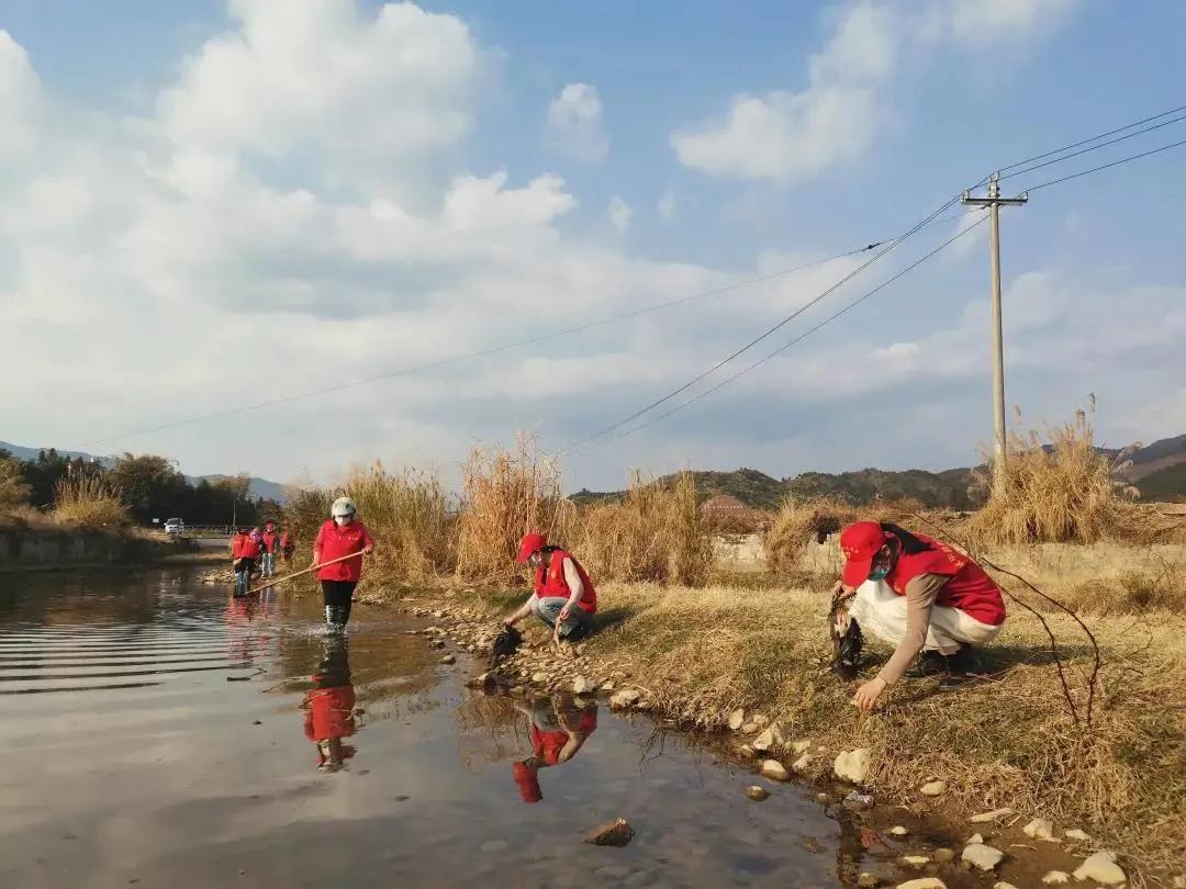 青年志愿者們帶上鉗子、垃圾簍等清潔工具,對上鎮村垃圾污染較嚴重的河道進行“護河”行動,認真清理水面垃圾。