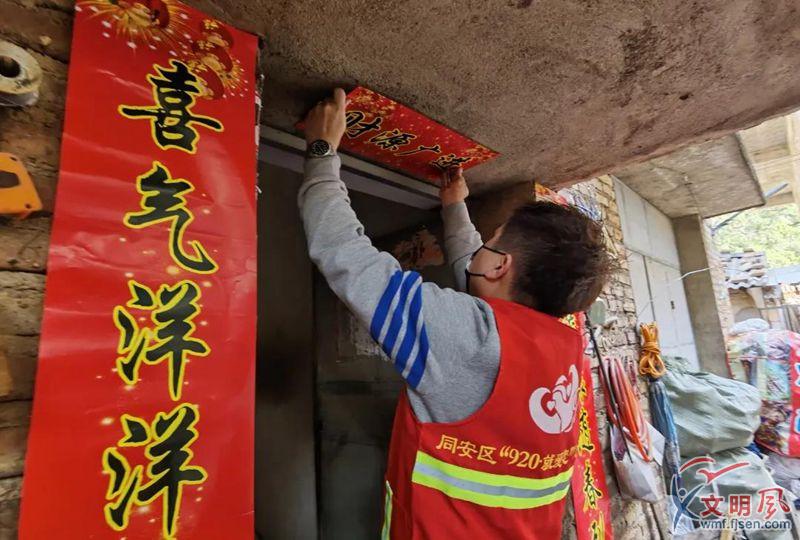 志愿者入戶貼春聯(lián)。(同安區(qū)供圖)