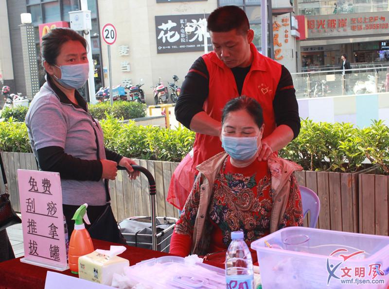 在另一側的中醫保健也吸引不少群眾排隊,在這里,志愿者耐心地解答群眾的問題,并為他們進行免費的刮痧、推拿和拔罐。“肩頸輕松了很多,沒那么酸疼了。”林先生開心地說道,這樣的志愿服務特別貼心。