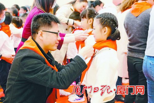 家長親手為新隊員佩戴上紅領(lǐng)巾。