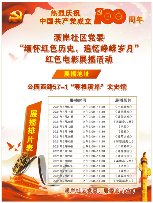 溪岸社區(qū)紅色電影展播時間和展播影片。溪岸社區(qū)制圖
