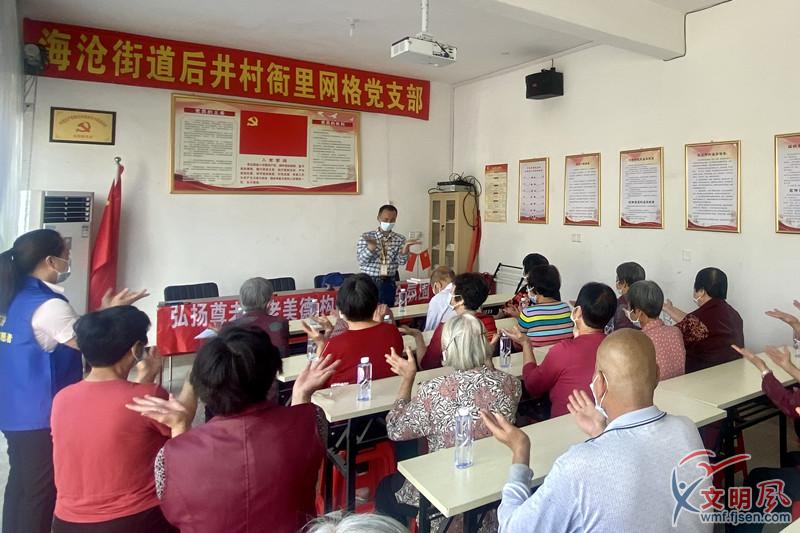 文明風4月15日訊(記者 盧超穎 通訊員 蔡惠紅) “手腕互擊36次、十指交叉互擊36次、手背互擊36次,來,爺爺奶奶咱們一起做……”4月13日下午,廈門市海滄街道后井村計生協會、老年協會攜手廈門市智宇孝老集團聯合在衙里網格黨支部會議室開展老年人手指操教學活動,轄區內30余位老年人前來參與活動。