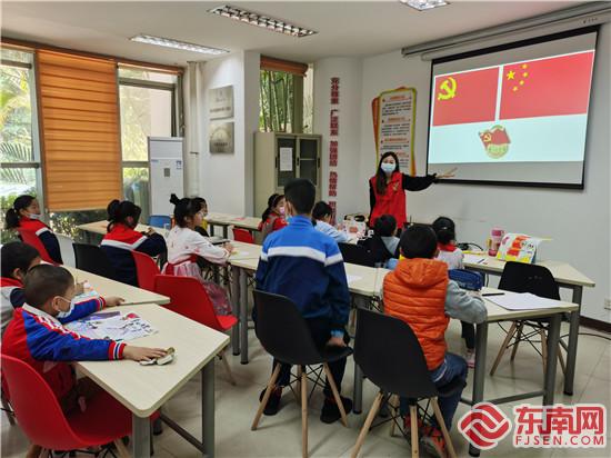 社工帶領(lǐng)青少年認識黨旗、黨徽。(康城社區(qū)新時代文明實踐站 供圖)