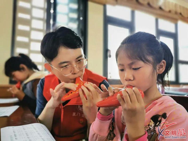 志愿者和孩子們一起學(xué)習吹奏陶笛。(同心慈善會供圖)