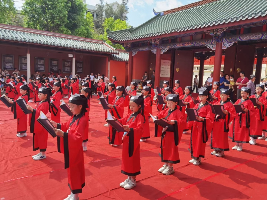 當天上午9時,身著紅色漢服的百余名師生,依循古禮走過狀元橋、整理衣冠、行五揖禮,集體朗誦《弟子規》,樂器合奏《阿爸的故鄉》,合唱《禮運大同篇》《讓愛傳出去》,弘揚深厚的儒家文化,傳遞溫暖的師生情、同學情。