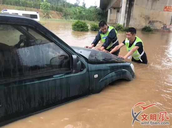 黃匯明(左一)與隊員對受困車開展施援(翔安區委文明辦供圖)