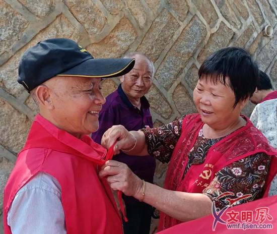 志愿者為老人系上紅領巾 (翔安區委文明辦供圖)