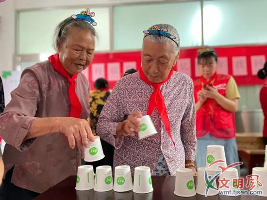 老人在體驗疊杯子游戲(翔安區委文明辦供圖)