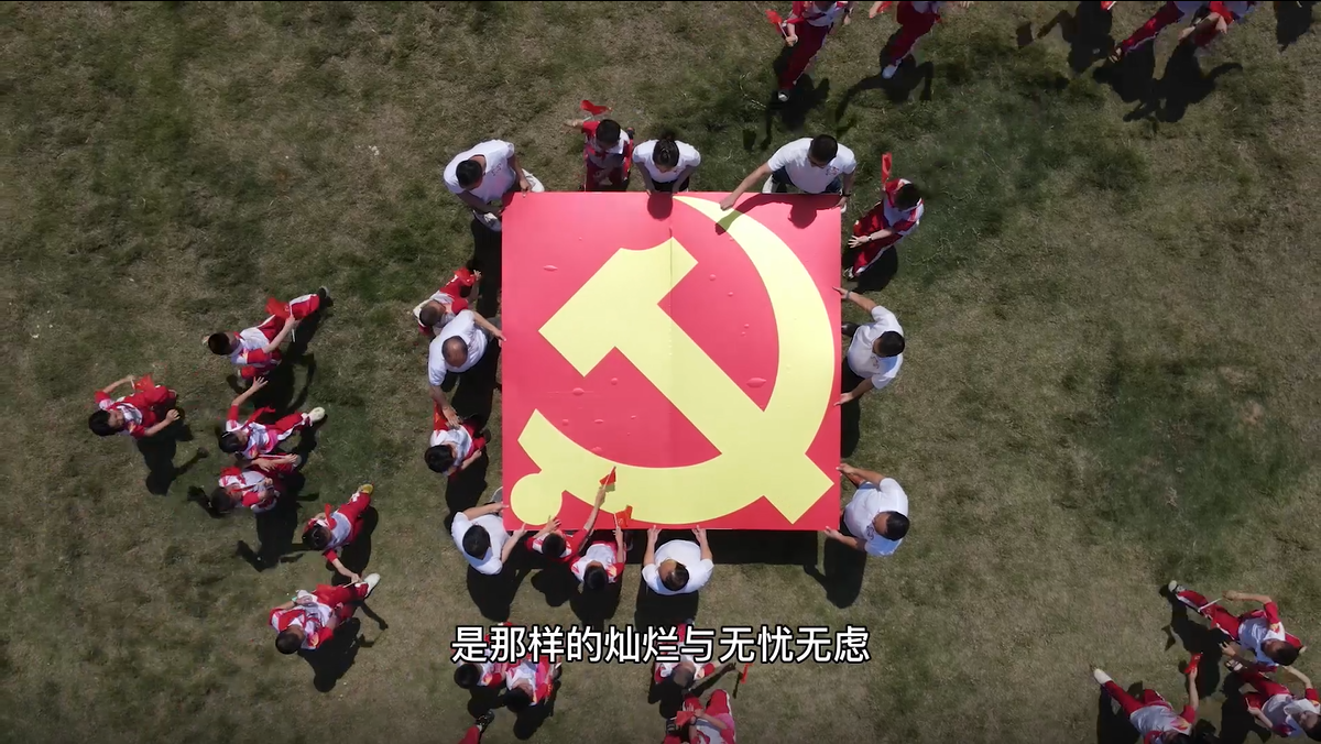 操場(chǎng)上空,無(wú)人機(jī)升空,記錄下一張張黨徽旁的笑顏,是那樣的燦爛與無(wú)憂無(wú)慮,稚氣的面龐透露著對(duì)黨堅(jiān)定的信仰與熱愛(ài)。