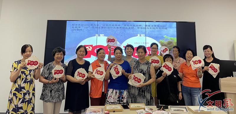 在廈門花工房手作社創始人、刺繡與拼布手藝匠人許嫣紅老師的親身教學下,社區黨員和居民們開始動手制作自己的刺繡作品。此次刺繡作品,整體色彩以紅黃為主,紅色代表革命,黃色代表光明。畫面主體以紅色數字“100”作為主要的設計元素來突出主題,中華柱與太陽月亮構成100字樣。