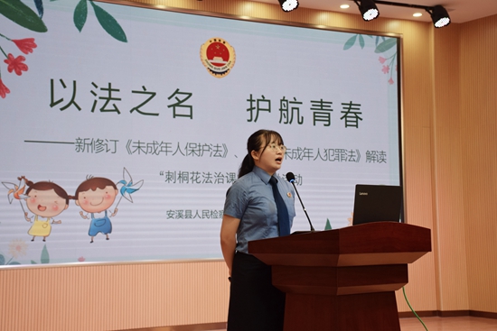 活動現場,安溪第十一小學校組織表演了歌曲《游子吟》、快板《喜慶建黨一百年》、合唱《我和我的祖國》等精彩節(jié)目。隨后,縣人民檢察院檢察官助理鐘秋梅講授《以法之名 護航青春》專題法制課,對新修訂《未成年人保護法》《預防未成年人犯罪法》進行解讀。最后,活動在有獎知識問答互動中圓滿結束。(安溪縣第十一小學 黃華玲)