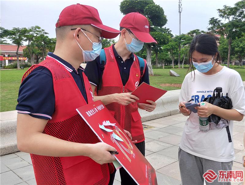黨員志愿者在嘉庚公園內(nèi)邀請游客參與“黨史知識問答”互動。(集美·誠毅志愿者聯(lián)盟供圖)