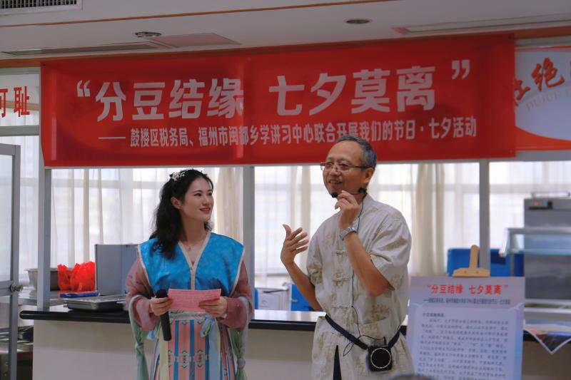 閩都鄉學講習所文化志愿者、中國好人方杰,分享七夕民俗文化。(鼓樓稅務局供圖)