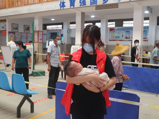 在東橋鎮一處核酸檢測點,采樣工作開始前,志愿者搬運設備、布置帳篷、運送防疫物資,迅速完成布置。檢測開始后,志愿者不厭其煩解答中老年人使用智能手機過程中遇到的問題,教中老年人登記核酸檢測信息,時刻提醒群眾戴好口罩,保持安全間距。志愿者還化身“臨時媽媽”,幫助受檢群眾照顧嬰幼兒,為群眾有序接受核酸檢測提供便利。