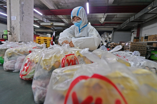 超市志愿者正在打包整理,給泉港區界山鎮群眾配送生活物資。林弘梫 供圖