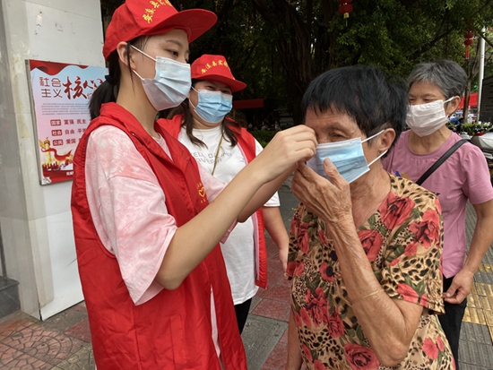 志愿者提醒居民戴好口罩。安溪文明辦 供圖