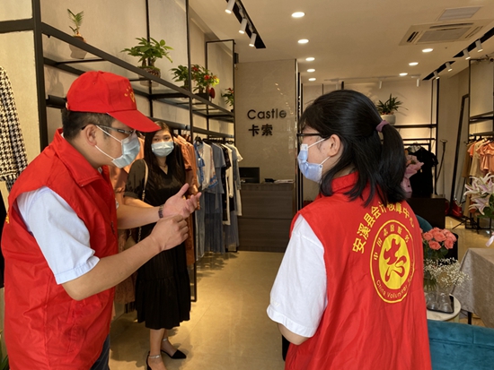 志愿者入商鋪宣傳防控知識。安溪文明辦 供圖