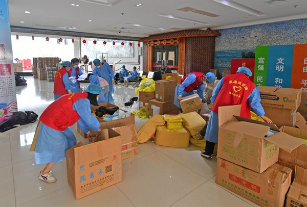 一群來自社會各界的黨員群眾組成的志愿者在整理防疫物資。林弘梫 供圖
