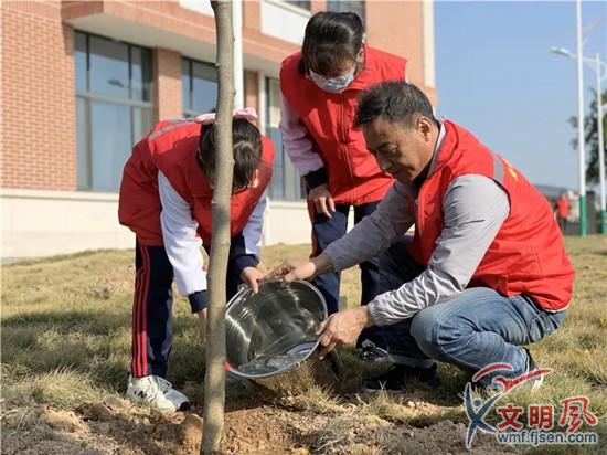 校長與小小志愿者參與植綠護綠活動(廈門市新圩學校 供圖)