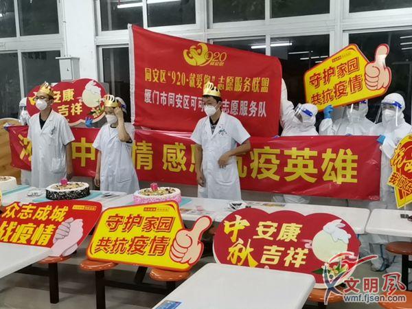 中秋佳節(jié)日,有愛防疫不放松。21日下午,廈門市同安區(qū)委文明辦攜手同安區(qū)總工會、區(qū)紅十字會、區(qū)衛(wèi)健局,為本月過生日的一線醫(yī)護(hù)人員送去生日蛋糕和祝福,同時,發(fā)動愛心企業(yè)捐贈月餅、飲料等愛心物資約5000份,陸續(xù)分發(fā),并向在中秋節(jié)堅(jiān)守崗位的抗疫一線醫(yī)護(hù)人員表示敬意和節(jié)日的問候。