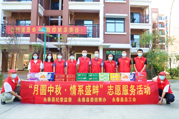9月16日,永春縣紀(jì)委監(jiān)委、縣委巡察辦、縣總工會聯(lián)合開展“月圓中秋·情系盛畔”志愿服務(wù)活動,慰問堅守在盛畔醫(yī)學(xué)觀察點(diǎn)的工作人員,為他們送去節(jié)日的祝福及方便面、面包、酸奶、菊花茶、冬瓜茶等愛心物資。(陳躍虹)