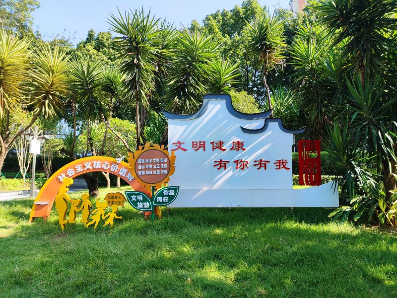 福州西湖社區西湖公園晨曦廣場內的“文明健康”主題景觀小品(鼓樓區委文明辦供圖)