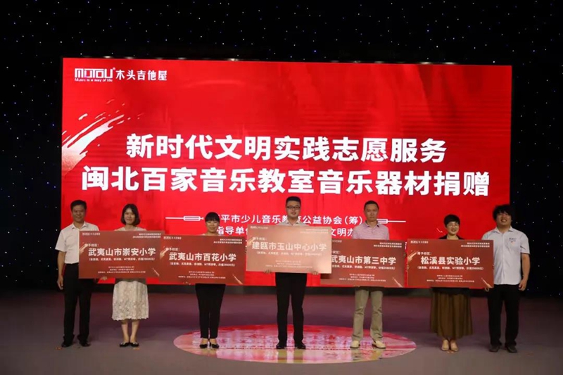 以音樂心,行公益事。作為南平市第一批新時代文明實踐活動志愿服務示范點,從2019年起,武夷山木子文化藝術有限公司計劃為閩北100所鄉村或城郊結合部小學捐贈音樂器材,平均每所學校捐贈價值達39800元,目前已經捐贈了7個縣市的10多所學校。