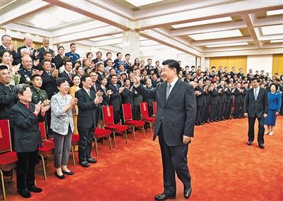 上午11時,習近平等來到人民大會堂北大廳,全場響起熱烈掌聲。習近平等走到代表們中間,同大家親切交流并合影留念。