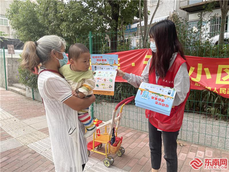 東宅村新時代文明實踐站志愿者分發《垃圾分類 清新集美》宣傳單(集美區新時代文明實踐中心供圖)